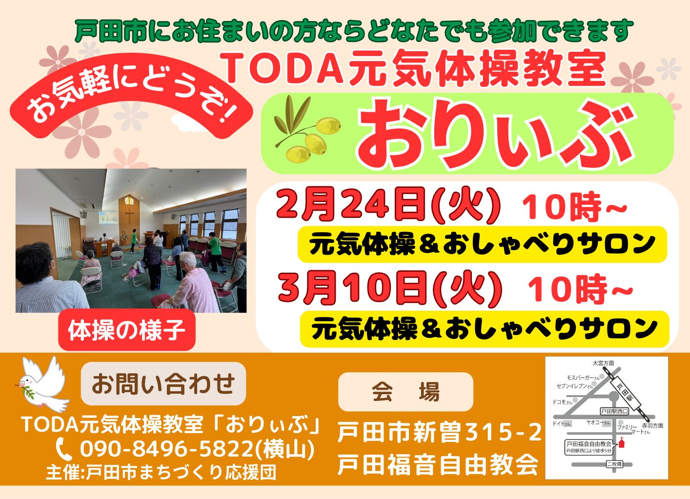 - 「おもり体操」&「おしゃべりサロン」TODA元気体操教室「おりぃぶ」と「おしゃべりサロン」 次回は2026年4月14日(火)10:00から! 毎月… 続きを読む: 「おもり体操」&「おしゃべりサロン」